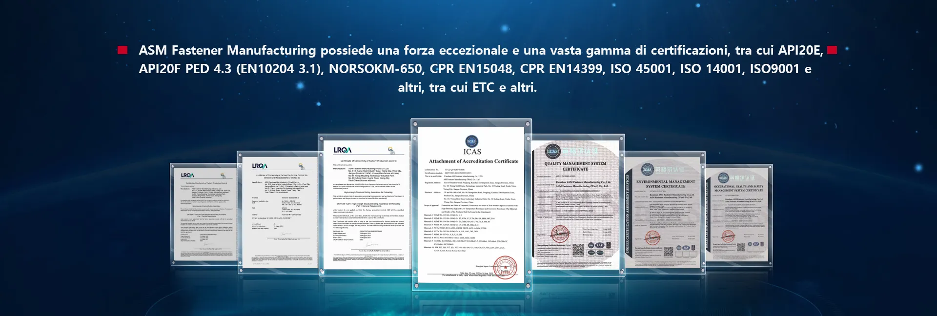 Le certificazioni della società includono ISO 9001: 2000, ISO 14001, ISO 45001, licenza di produzione di attrezzature speciali (pipeline di pressione) TS Certificazione, Nosok M650, UE CE, PED 4.3, CPR 14399, CPR 15048 e EN 10204 3.1, tra gli altri.